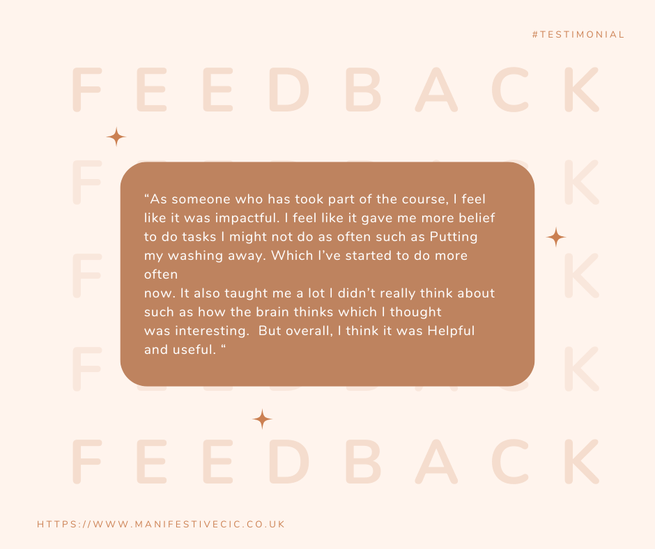 This is a few testimonies from our recent cohort of the development programme we run funded by The National Lottery Community Fund and ran by ManifestiveCIC.